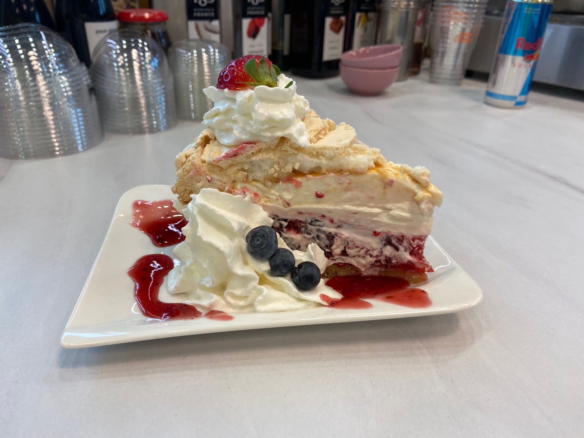 Malinowa chmurka z malinami i płatkami migdałowymi